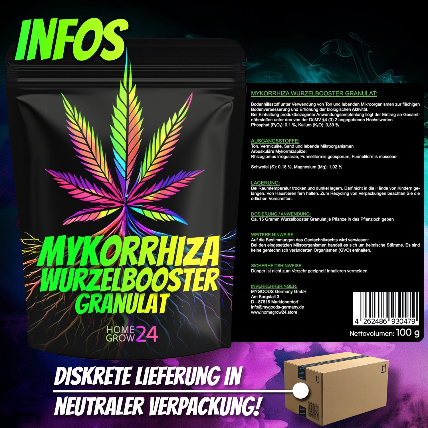 Mit dem Homegrow24 Mykorrhiza Wurzelbooster pflegst du den Wurzelbereich deiner Pflanzen auf natürliche Weise. Das Granulat kombiniert Mykorrhiza und nützliche Mikroorganismen für ein lebendiges Substrat und tragfähige Wurzelstrukturen – ideal für Erde, Coco & Mischsubstrate, Indoor & Outdoor.
